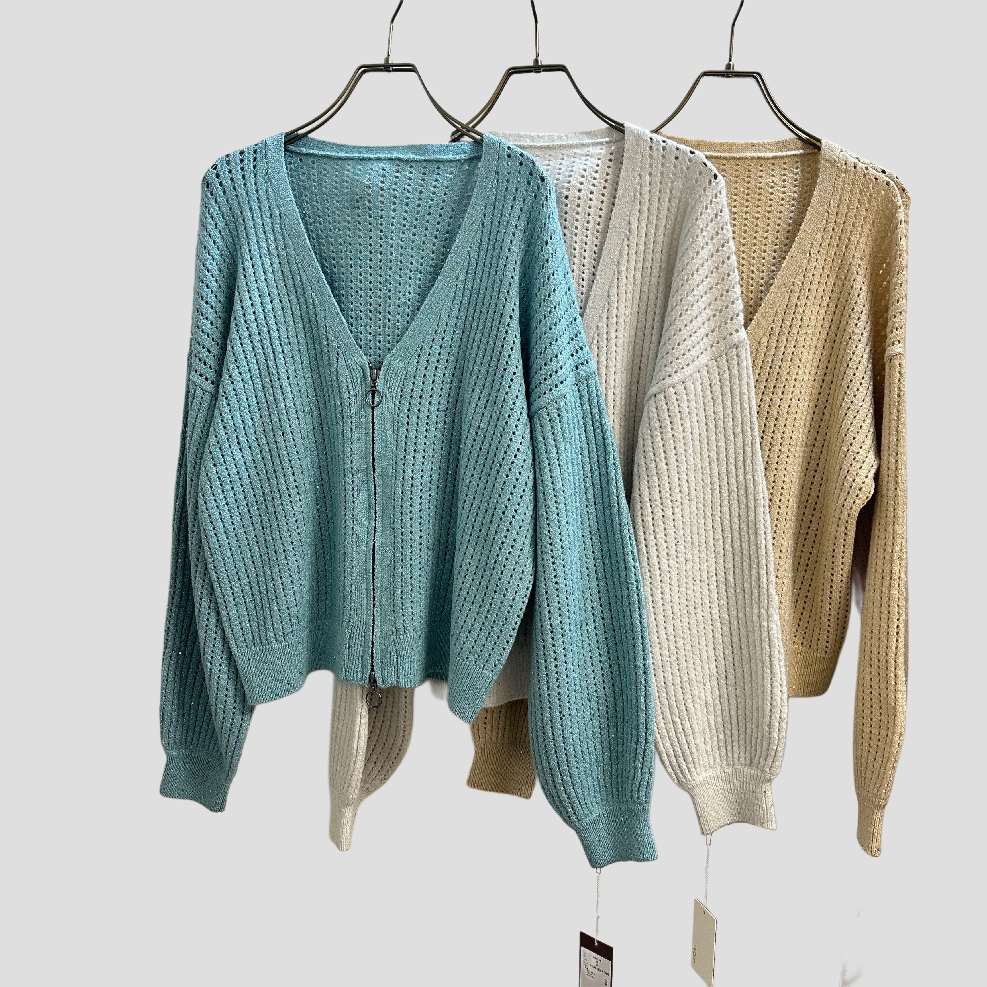 ギラギラと光過ぎない、柔らかな光沢のラメとスパンコールを使用したジップアップカーディガン